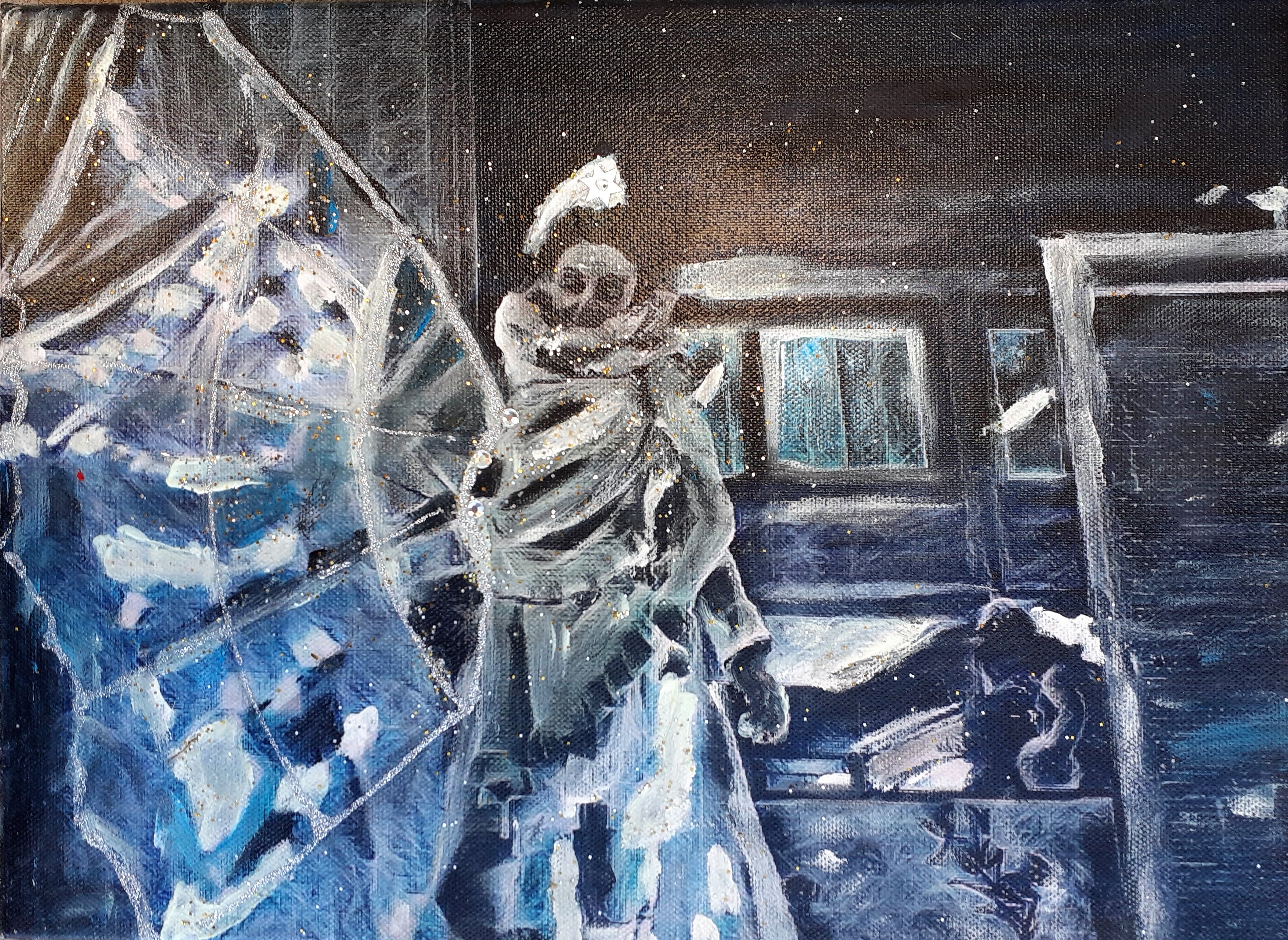 Quello sul retro è un lavoro denominato “L’artista di strada”, rappresenta un quadro sempre a quattro mani con Cusin, ma in questo caso si vede un po’ di più l’apporto di Magnus per uso delle tecniche di realizzazione (glitter e strass).